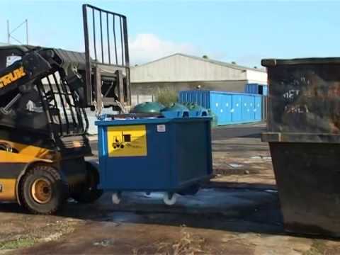 Dumping large amounts of waste is made easy with our forklift auto dumping container. Simply drive the forks into the channels, tie the chain to the forklift to connect both, and drive to the skip and lift. It releases automatically by lowering onto the edge of the skip and the base of the container opens and drops the waste. It then re-locks when lowering after the load load has been tipped.